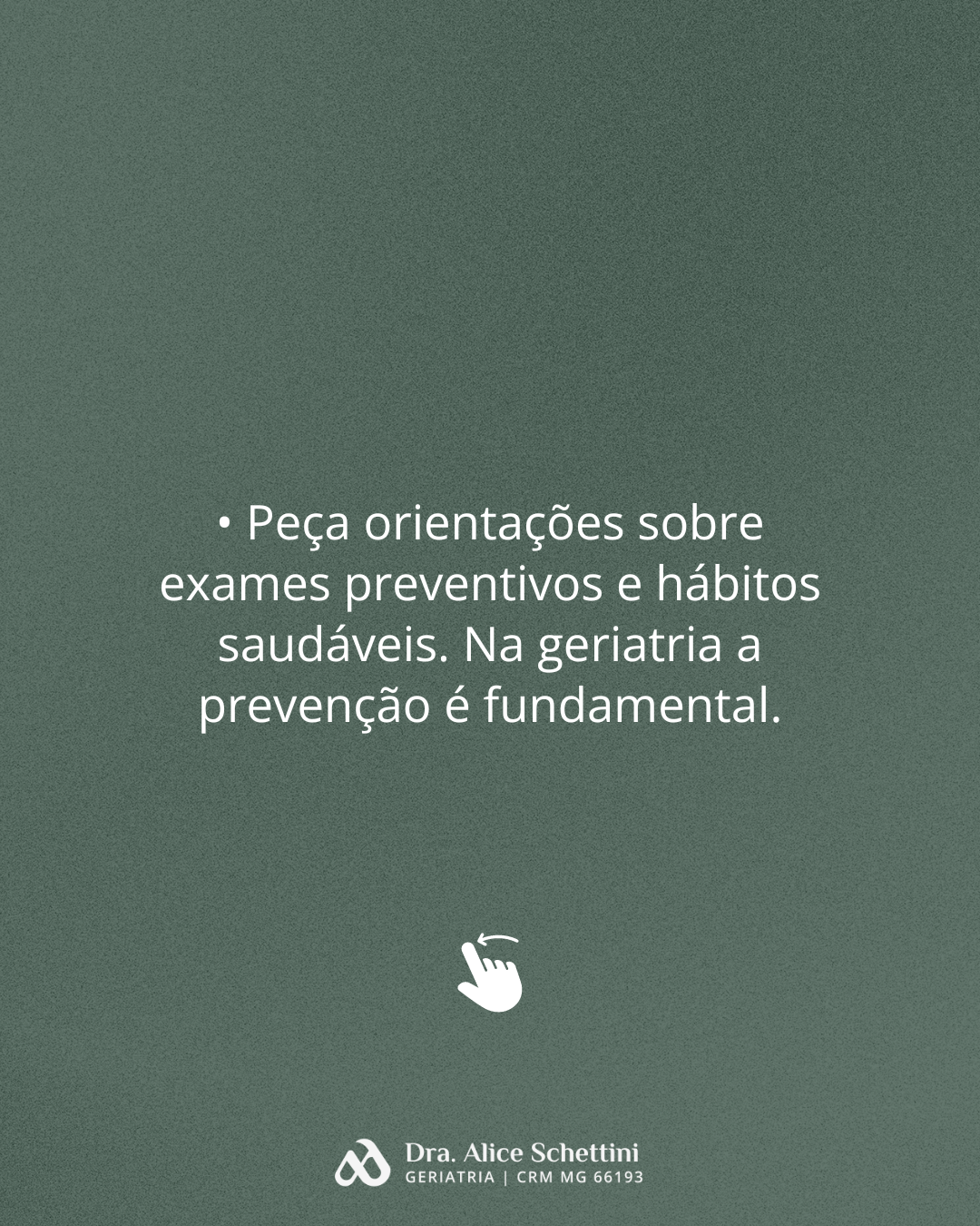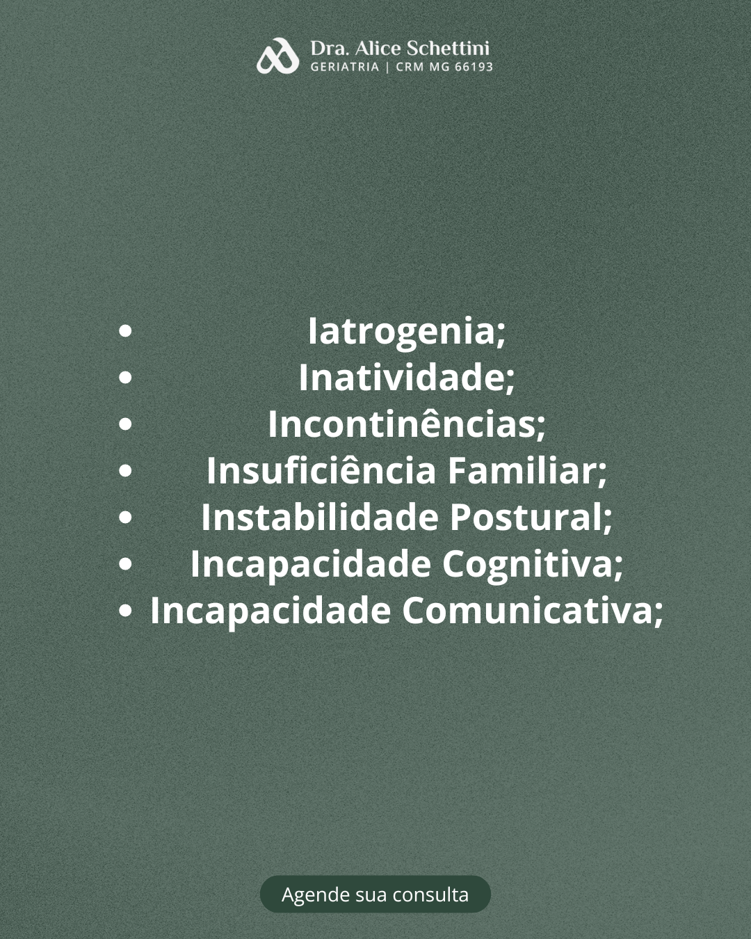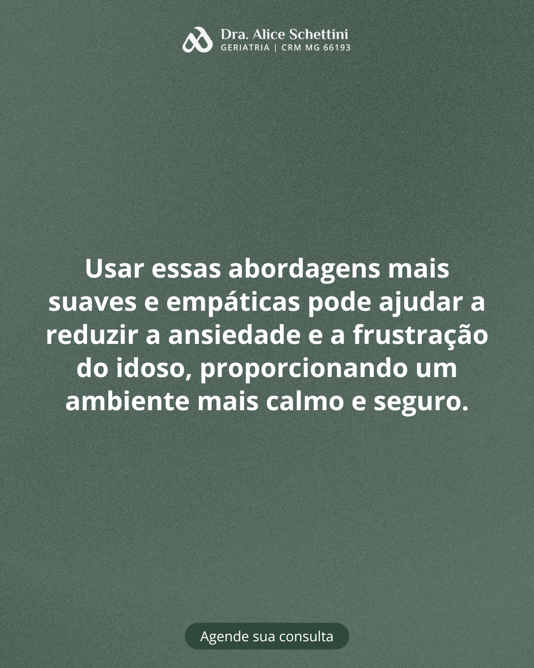 O geriatra é o médico que trata do envelhecimento humano, através de uma avaliação sistemática do paciente, com foco em qualidade de vida. Diferencia as alterações funcionais próprias do processo natural de envelhecimento das alterações patológicas ocorridas nessa fase da vida. Quando procurar um geriatra? prevenção: orientações para envelhecer de forma saudável acompanhamento da senescência (envelhecimento saudável) acompanhamento de doenças já presentes nessa fase de vida Busco olhar de forma ampla sobre o idoso, atentando sempre às suas particularidades, suas necessidades, em busca da promoção da qualidade de vida. Acolher o paciente e sua família, esclarecendo diagnóstico e acompanhando o paciente em todos os momentos é fundamental